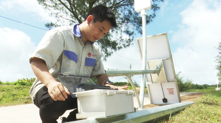 A Rang Dong expert checks the installation of a solar street lamp to make sure it is set up correctly for optimal performance and long-term reliability.