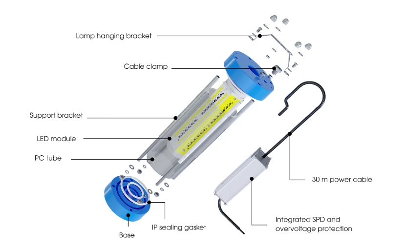 With an IP68 ingress protection rating, the fishing light operates reliably at depths of up to 10 m continuously, with surge protection capability up to 7 kV and overvoltage protection exceeding 290 V.