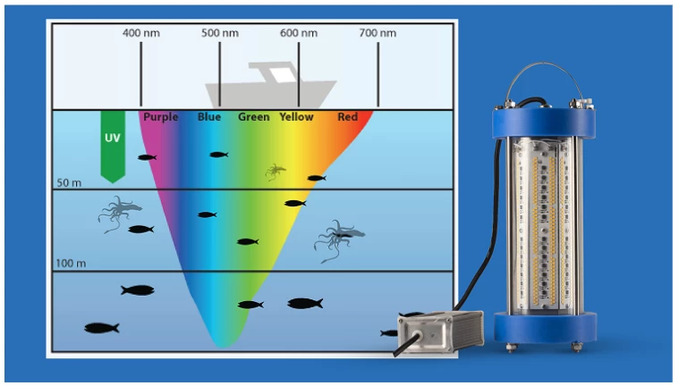 Specialized deep-penetrating light spectrum travels farther underwater, stimulating feeding activity and concentrating fish schools to attract various marine species.